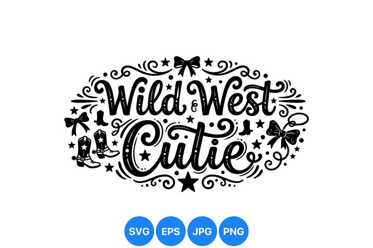 Playful black and white hand lettering reads wild west cutie surrounded by decorative cowboy boots bows stars and swirling accents creating a charming vintage style design.