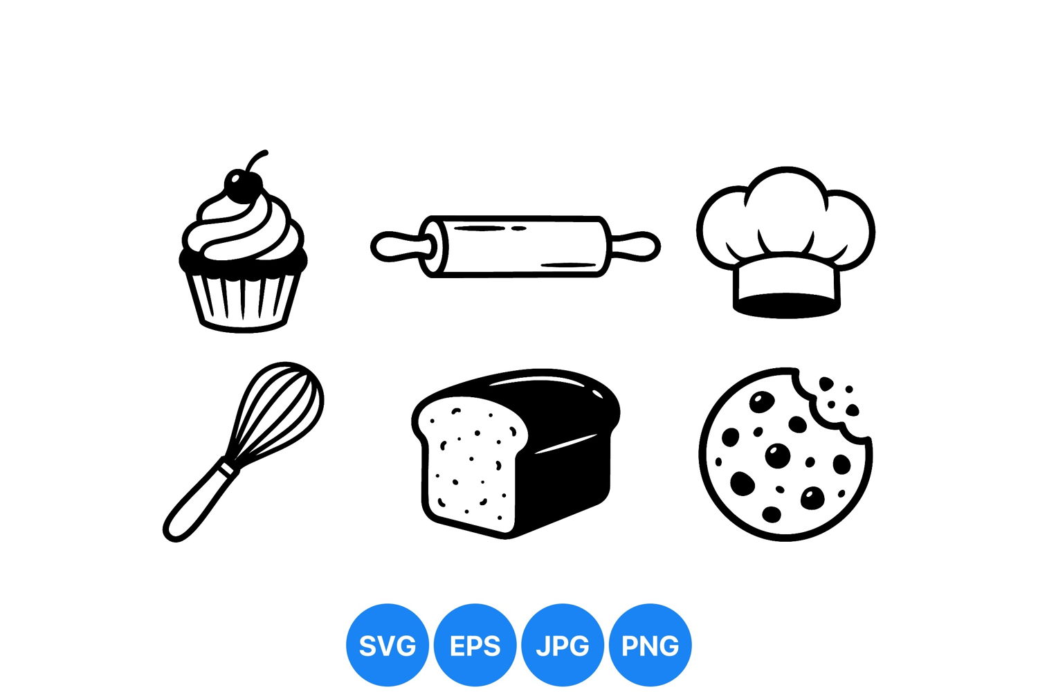 of monochrome baking icons featuring a cupcake with cherry, rolling pin, chef hat, whisk, bread loaf, and bitten cookie in simple vector style for food related designs.