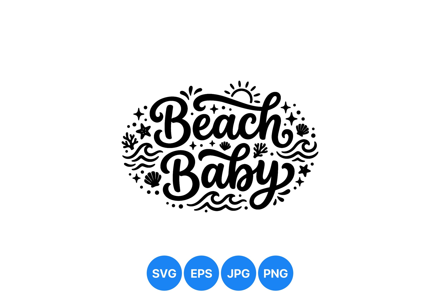 Black hand lettering text beach baby surrounded by sun waves corals seashells and starfish in a decorative vector design with bold playful style and nautical theme