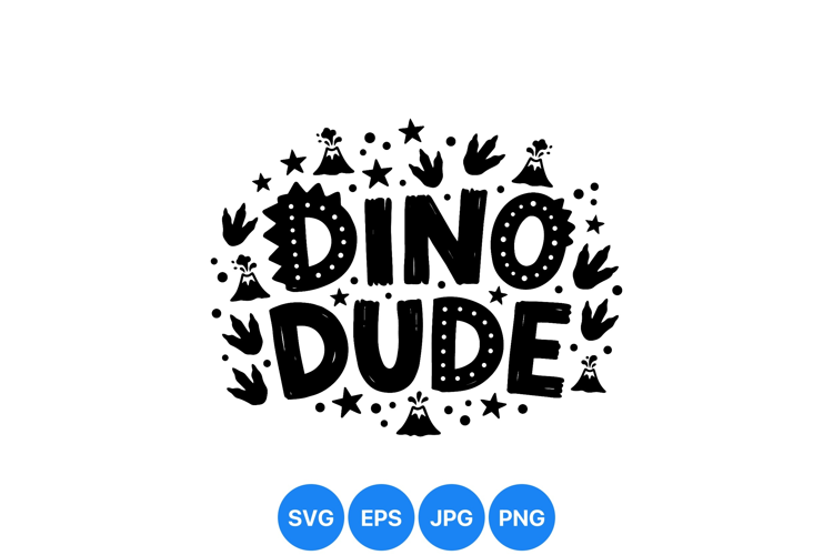 Black and white hand drawn lettering spells dino dude surrounded by dinosaur footprints stars and erupting volcano icons in playful style vibrant and bold