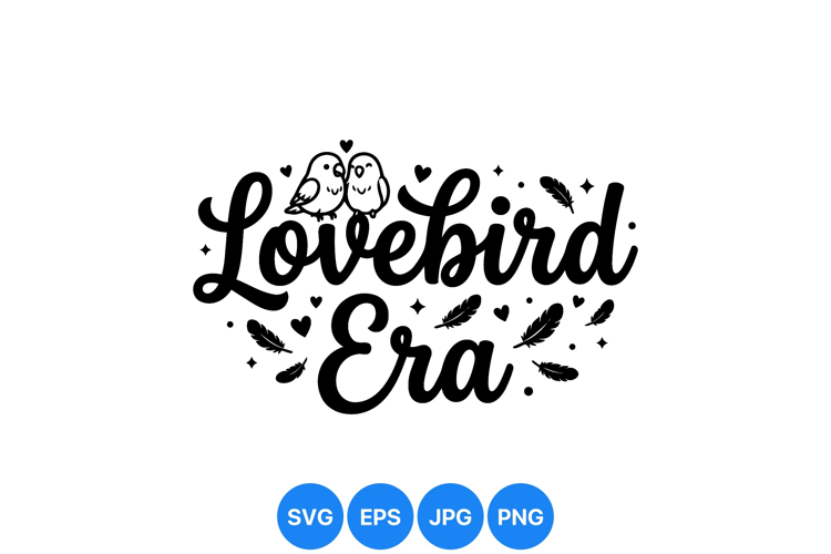 Elegant black and white calligraphy design with lovebird era text surrounded by two charming birds hearts and feathers creating a romantic and whimsical mood vector art