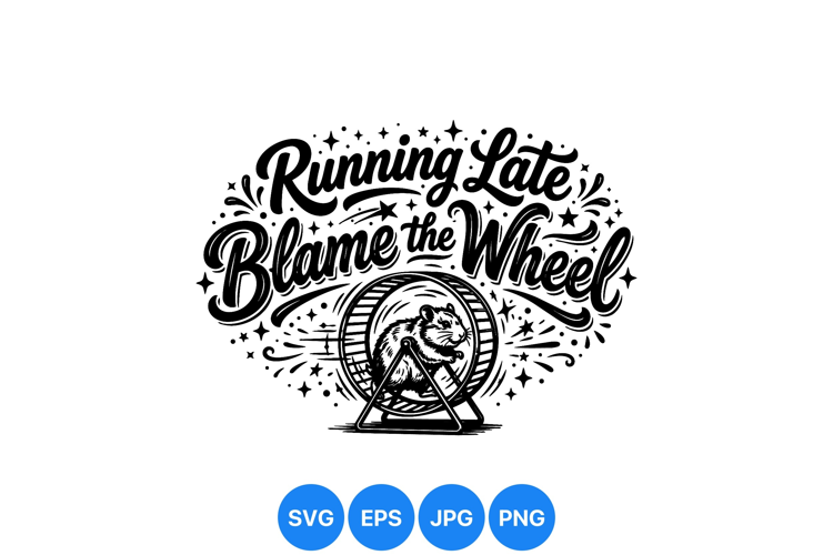 A detailed black and white vintage illustration shows a hamster running on a wheel surrounded by decorative stars with running late blame the wheel lettering design in retro style.