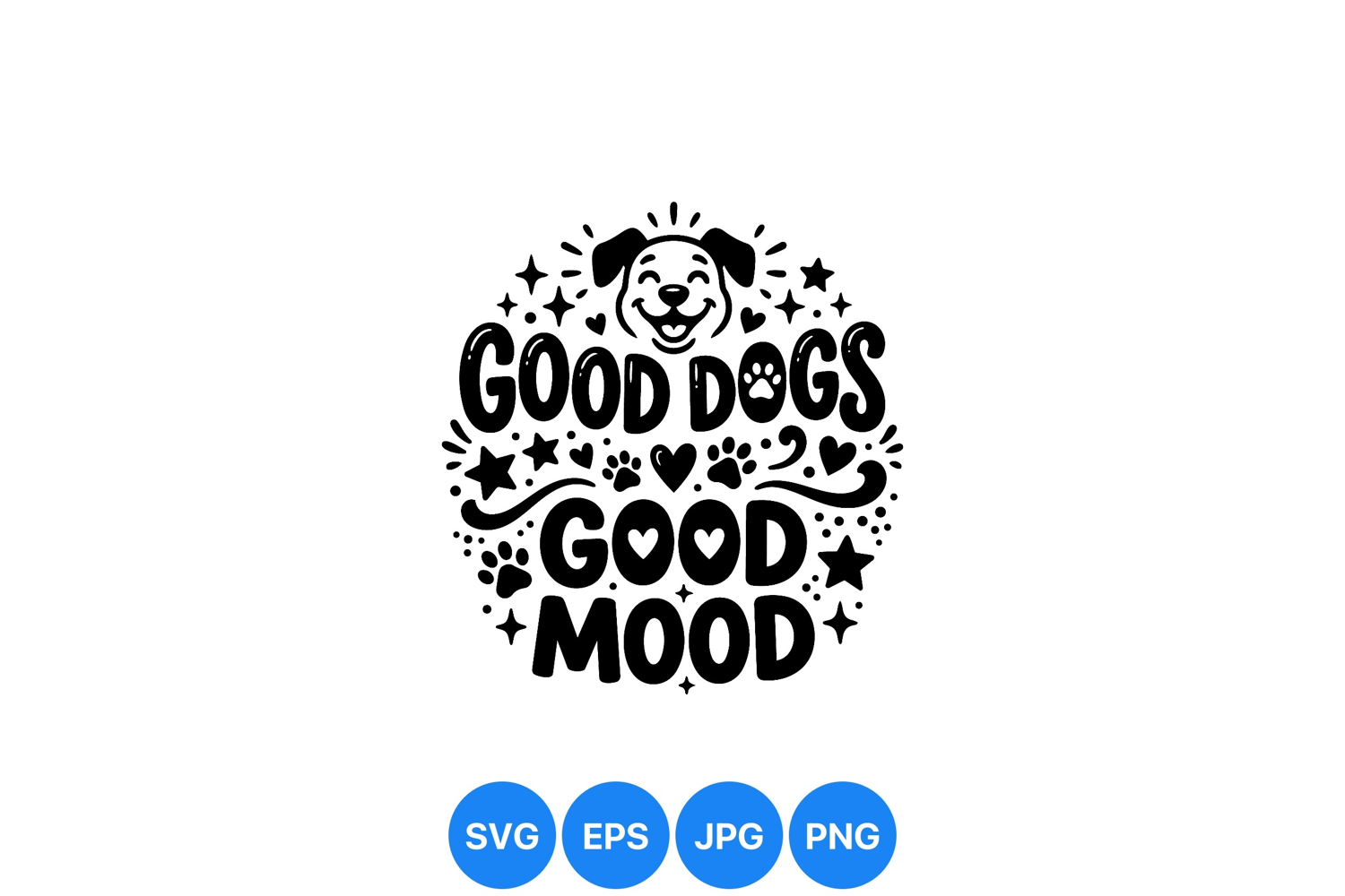 Smiling dog face with cheerful phrase good dogs good mood surrounded by decorative hearts stars and paw prints in black and white vector art style conveying happiness and positivity calm vibe