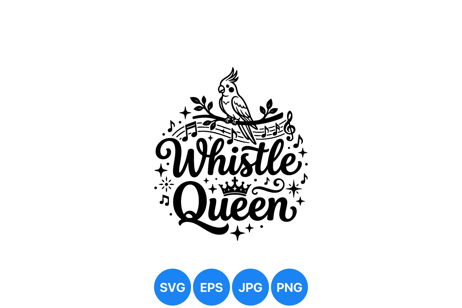A charming black silhouette vector shows a cockatiel bird on a branch surrounded by musical notes stars and a crown above playful whistle queen text elegant and whimsical