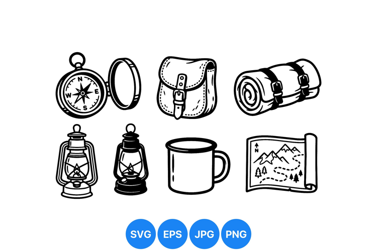 Hand Drawn Camping Outdoor Adventure Icons Black And White Vectors Compass Navigation Icon Camping Mug Graphic Vintage Hiking Icons Trail Map Illustration Lantern Clipart Design Wilderness Gear Art