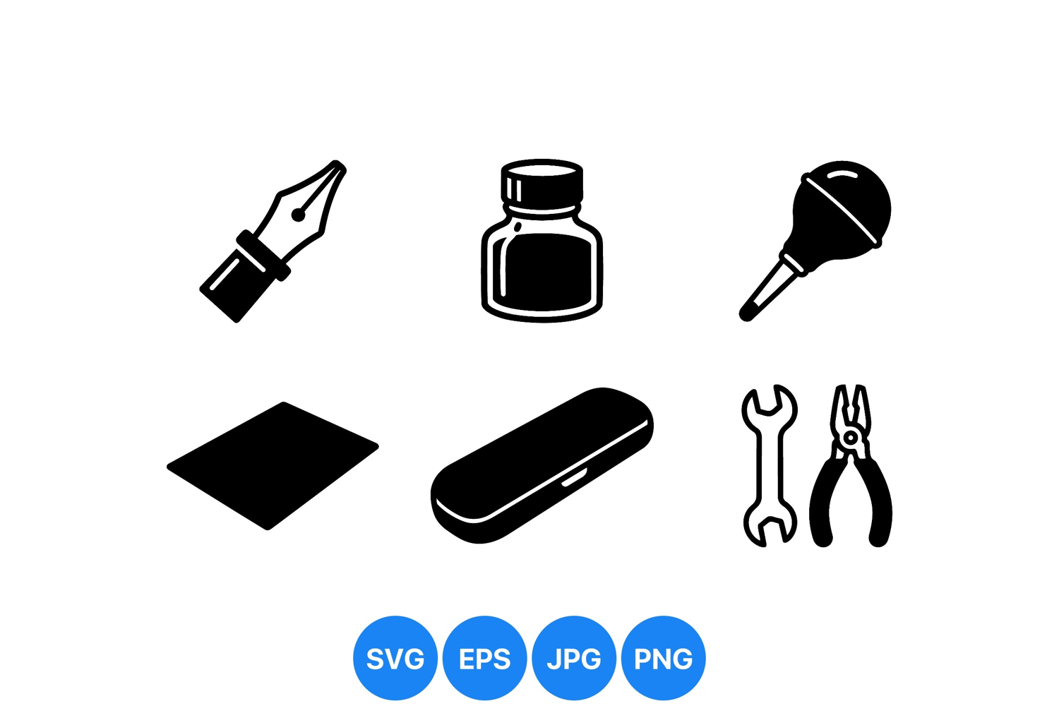 Six black silhouette icons showing fountain pen nib, ink bottle, rubber bulb air blower, cleaning cloth, case, wrench and pliers in minimalist vector style for design and tool illustrations.
