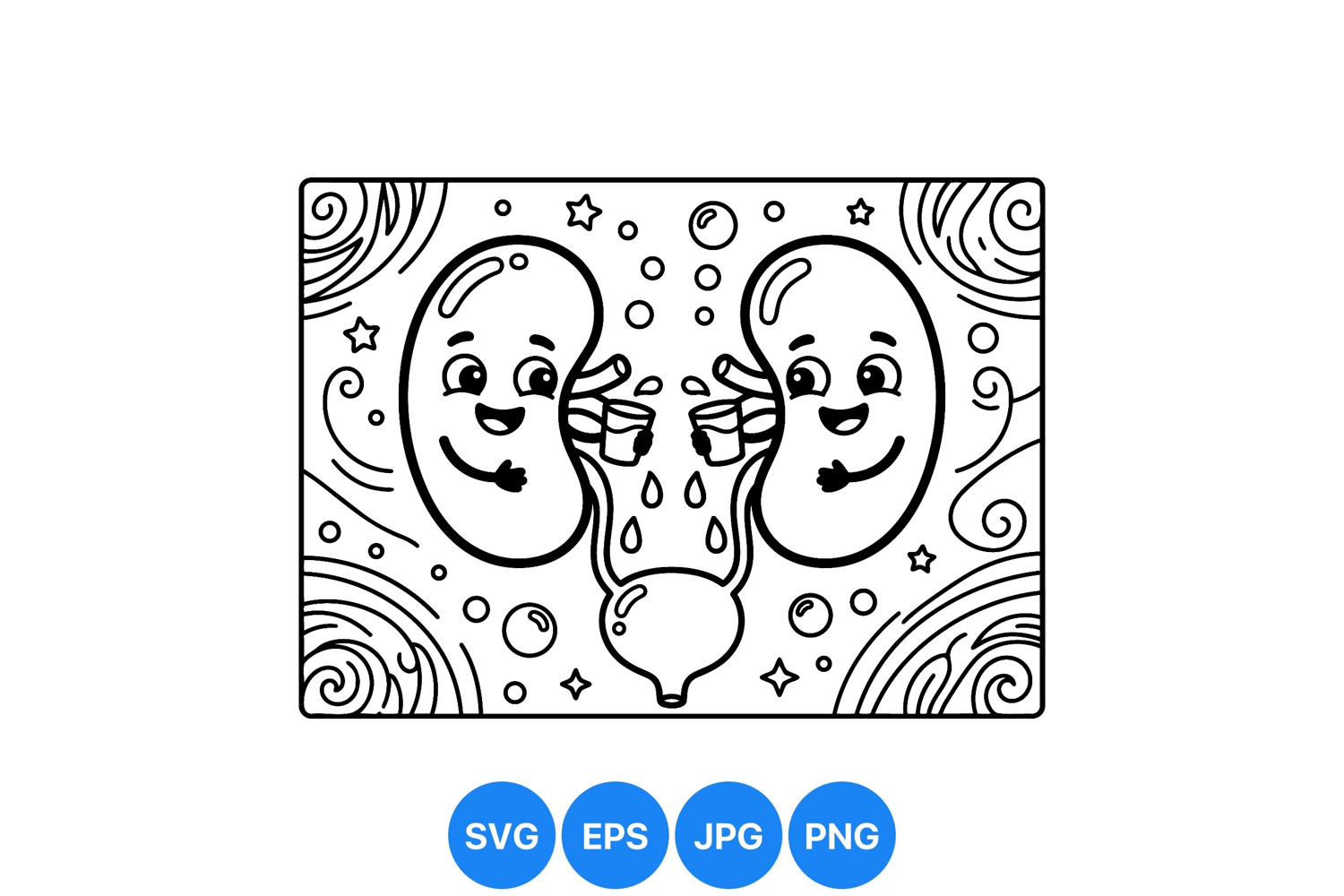 Playful black and white vector art shows two cheerful kidneys holding cups pouring water into a bladder with stars and swirling patterns creating a lively composition.
