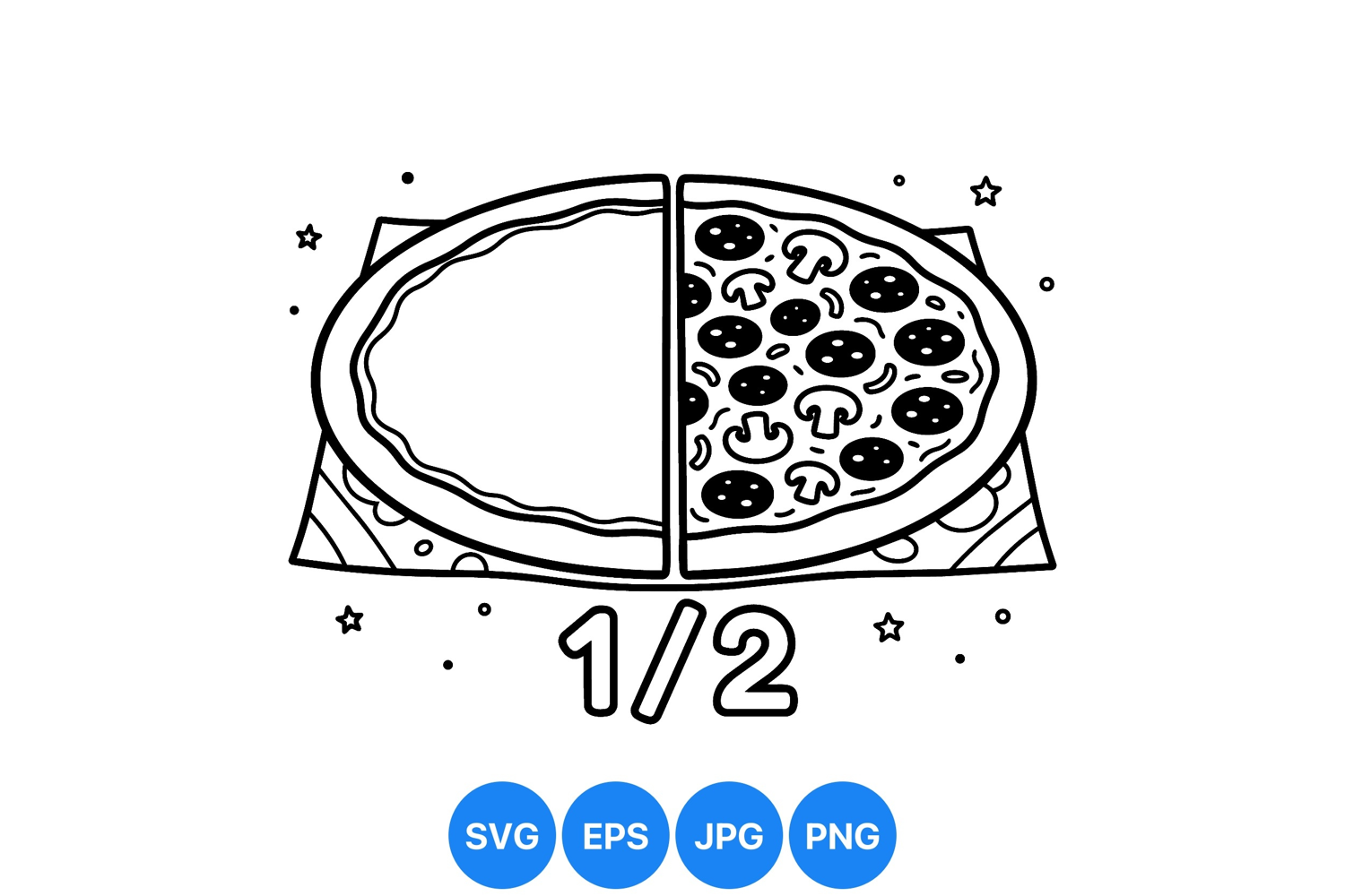 A minimal black and white line art vector shows a pizza cut in half with one side topped with mushrooms and pepperoni while the other half is empty.