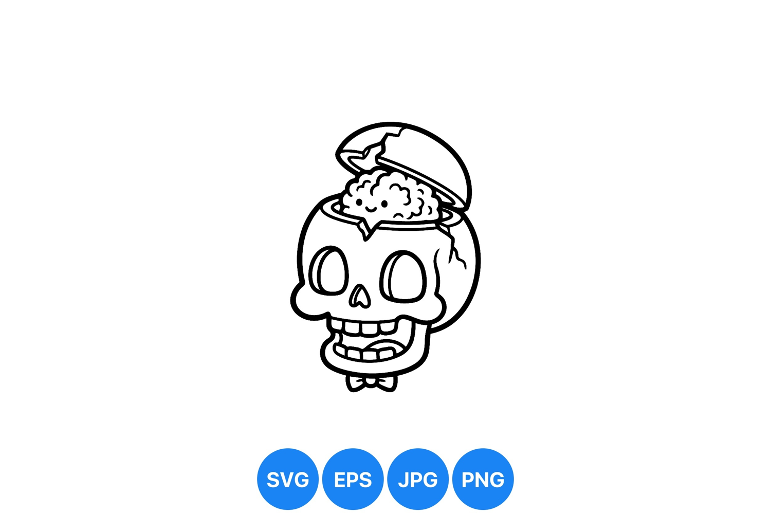 A whimsical line art design shows a smiling skull character with a cracked crown opening and exposed brain, created in cartoon style for creative or educational uses with a playful mood