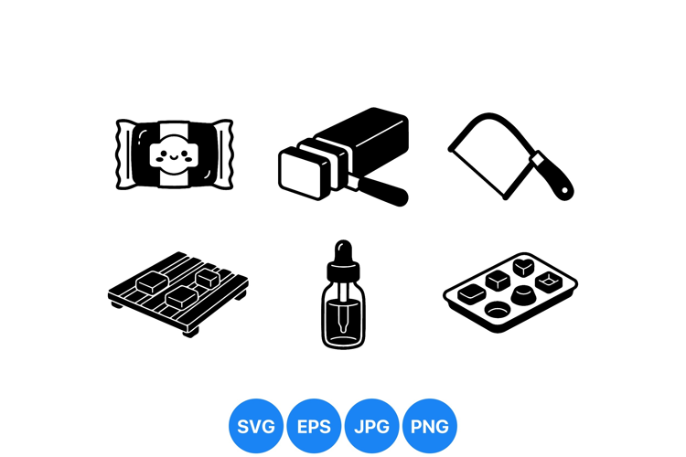 A of black and white flat design vector icons featuring cute candy mochi with smiling face sushi rolling mat kitchen knife and dropper bottle kitchen tools.
