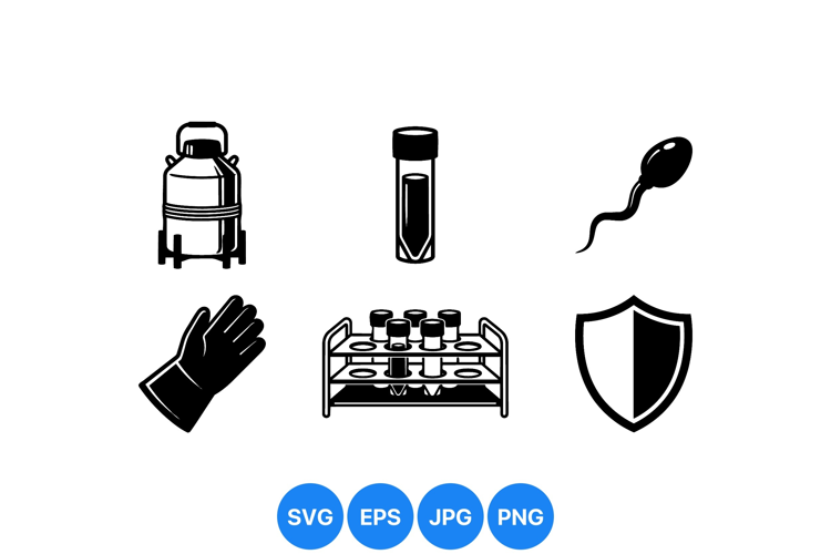 A of black and white laboratory vector icons including a test tube rack with samples, glove, sperm cell, shield for safety, and sample container, designed for scientific contexts.