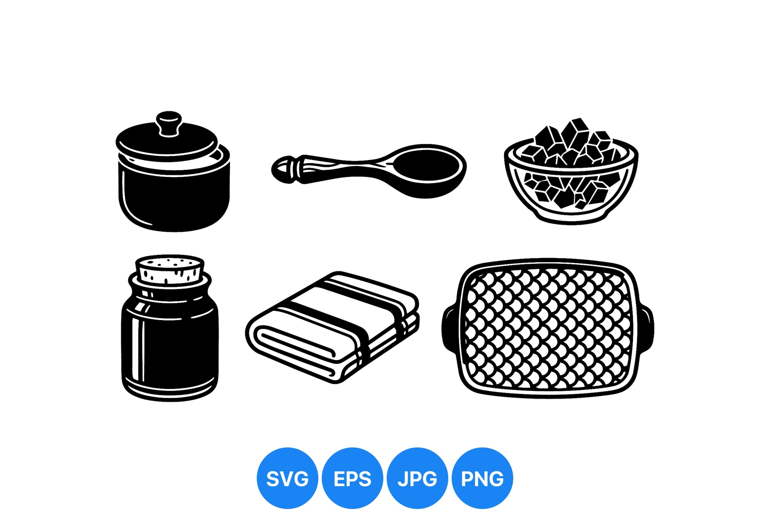 Monochrome vector kitchen utensils shows essential cooking items like pot with lid spoon sugar bowl jar towel and grilling pan in simple black and white style clean and bold