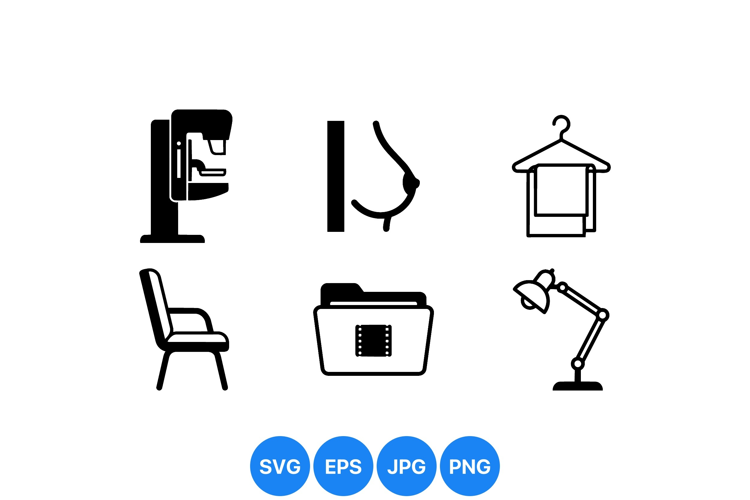 of minimalist black and white vector icons featuring a coffee machine, modern chair, adjustable lamp, file folder, and towel hanger, suitable for digital and print design projects.