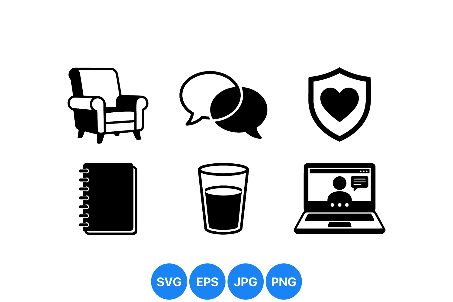 Digital Workspace Graphics Minimalist Office Icons Online Chat Symbols Modern Workspace Design Office Chair Silhouette Laptop Computer Design Spiral Notebook Illustration Water Glass Graphic Heart Protection Icon Communication Bubbles Clipart