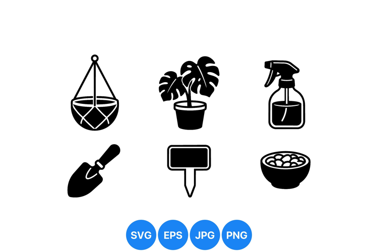 A of black silhouette icons featuring a hanging planter, monstera plant in pot, spray bottle, trowel, plant label, and seed bowl displayed in simple flat design style, clear and minimal.