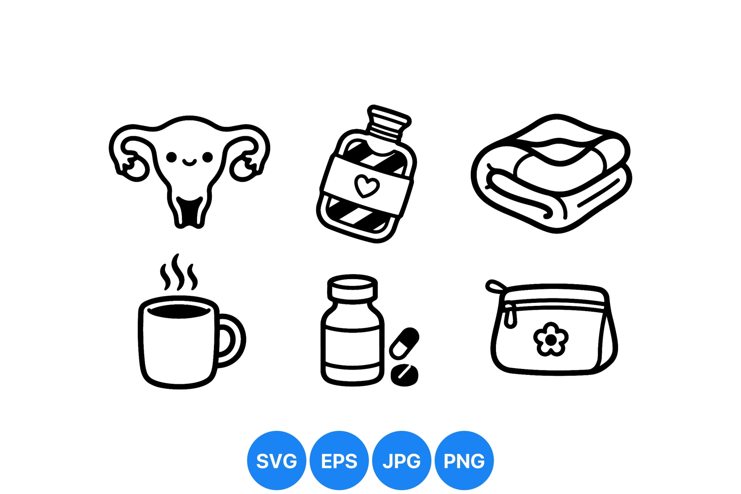 A of simple black and white vector icons featuring a smiling uterus, cup of hot drink, medicine bottles with pills, folded towel, and a cosmetic bag with floral decoration.
