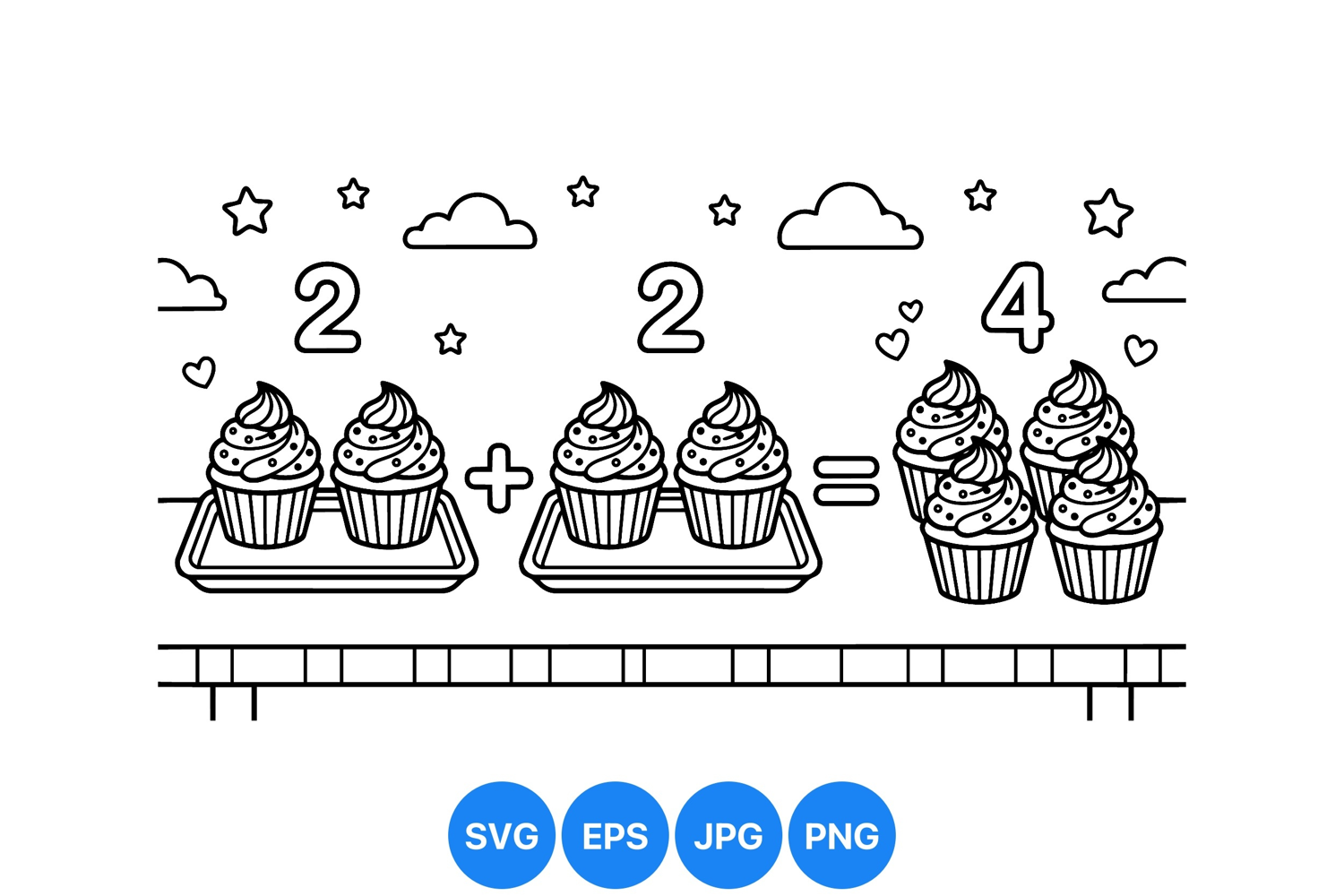 A playful black and white line art vector presents two trays with cupcakes illustrating a simple addition equation with decorative stars hearts and clouds above a grid line border
