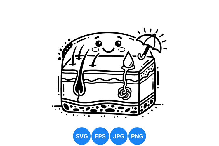 A cute smiling cartoon skin cross section shows hair follicle sweat gland and a sun protection umbrella in black line style suitable for educational or medical content vibrant and simple.