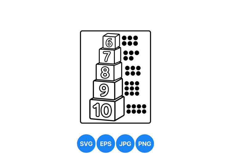 Black and white vector illustration of five stacked blocks numbered six to ten with matching domino dot patterns alongside in minimalist educational style for learning materials.