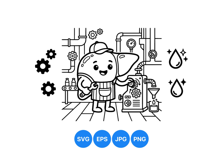 A charming liver cartoon character dressed as a mechanic repairs industrial machinery with a wrench among pipes and gears in a factory environment presenting a playful and educational mood.