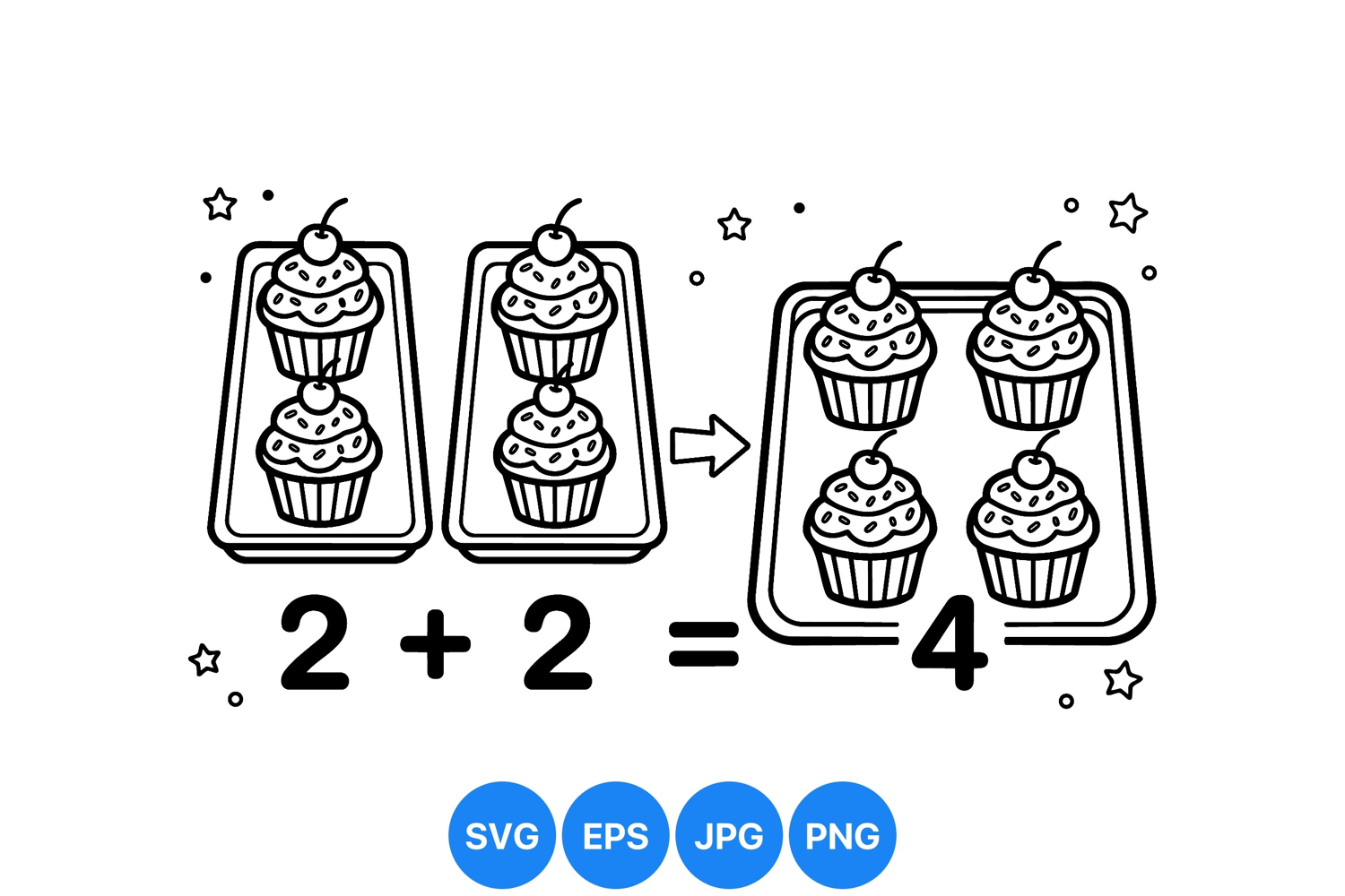 A flat style math illustration displays two trays with two cupcakes each combined into one tray holding four cupcakes visually explaining addition in a playful manner.