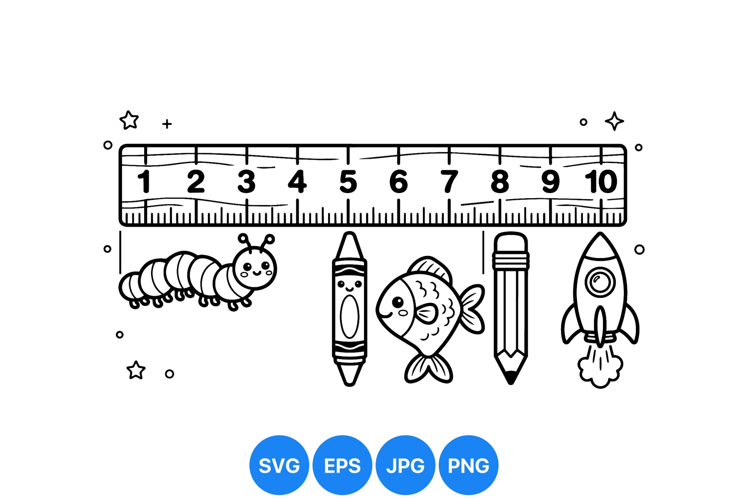 A playful black and white vector shows a ruler with a smiling caterpillar crayon fish pencil and rocket arranged below in a simple educational style illustration for kids.