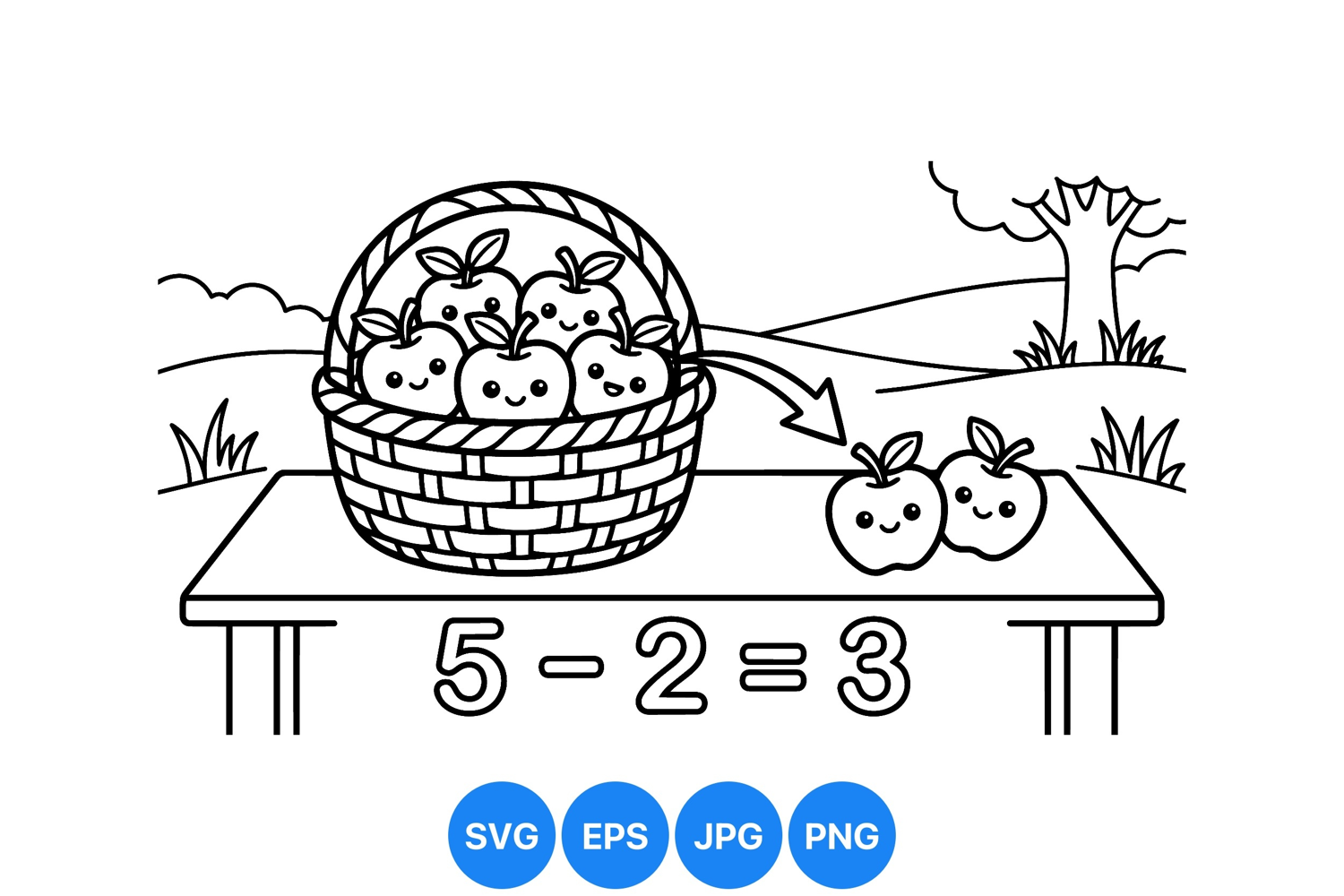 Black And White Drawing Kids Math Clipart Cute Fruit Illustration Children Learning Graphic School Teaching Aid Apple Counting Design Educational Math Image Vector Subtraction Art Printable Learning Graphic Fun Math Artwork