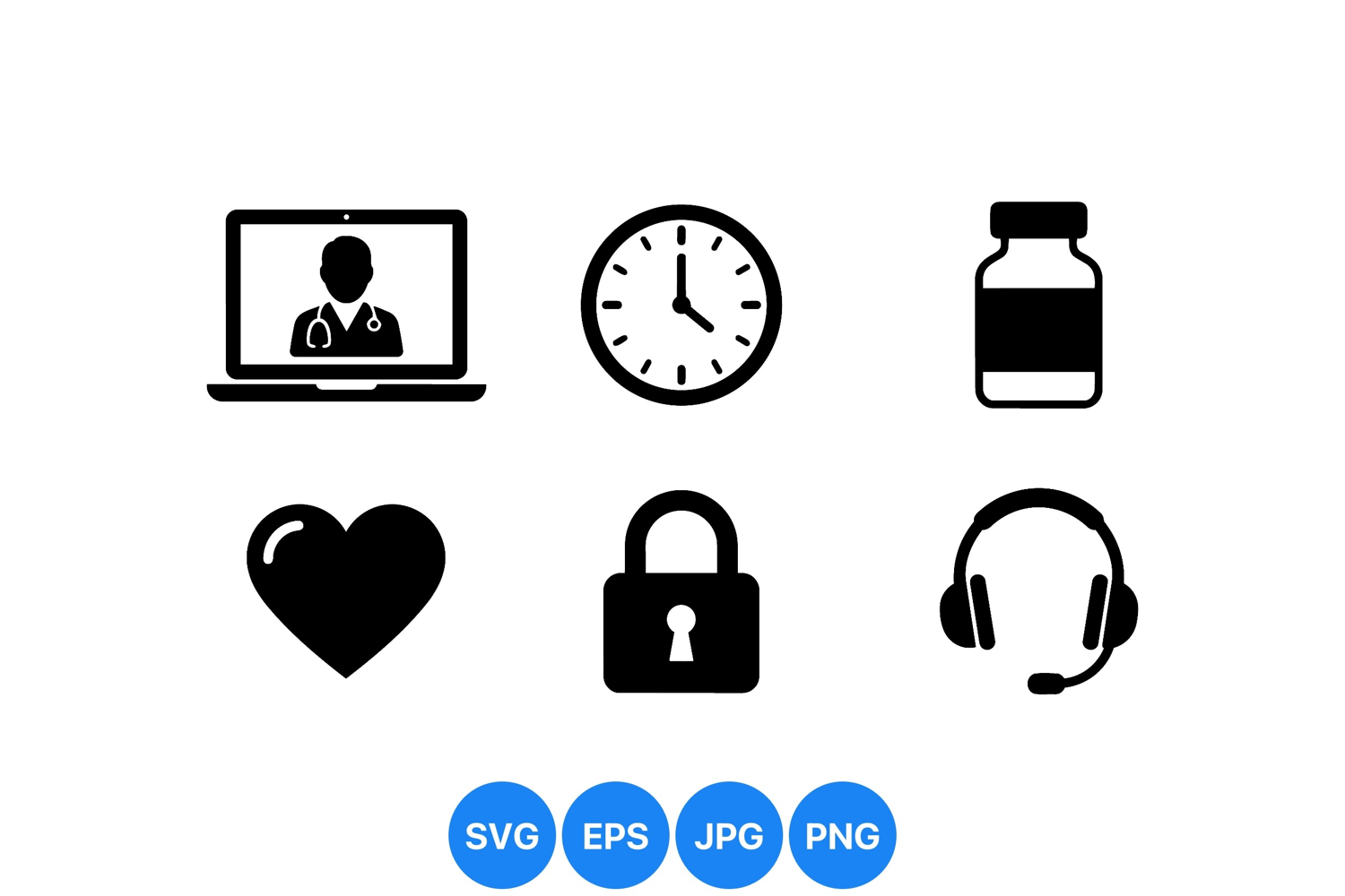 of six black silhouette icons including a doctor on a laptop screen, clock, medicine bottle, heart shape, padlock, and headset in a simple minimalist vector style.