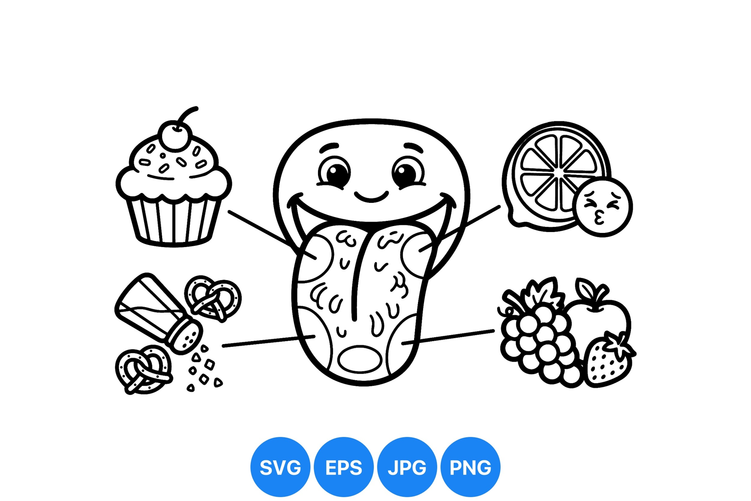 A playful cartoon vector graphic illustrates a smiling tongue highlighting taste buds linked to cupcake lemon salt grapes and strawberry icons with clear line art style for educational uses.