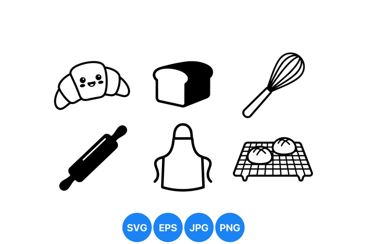 A of minimalist black and white vector icons featuring smiling croissant, loaf of bread, whisk, rolling pin, apron, and baked bread resting on a cooling rack in simple line style.