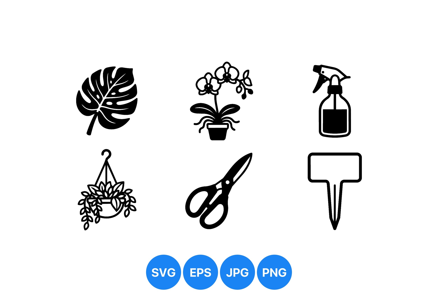 of black vector icons showing monstera leaf, orchid flower in a pot, spray bottle, hanging plant, scissors, and plant label sign representing gardening and indoor plant care equipment.