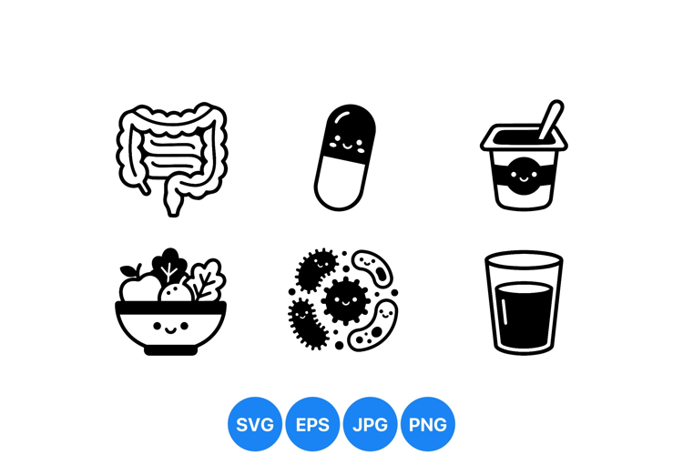 Cute black and white vector icons showing digestive system, smiling probiotic capsule, yogurt container, fresh salad bowl, friendly bacteria, and glass of juice in minimalist style.