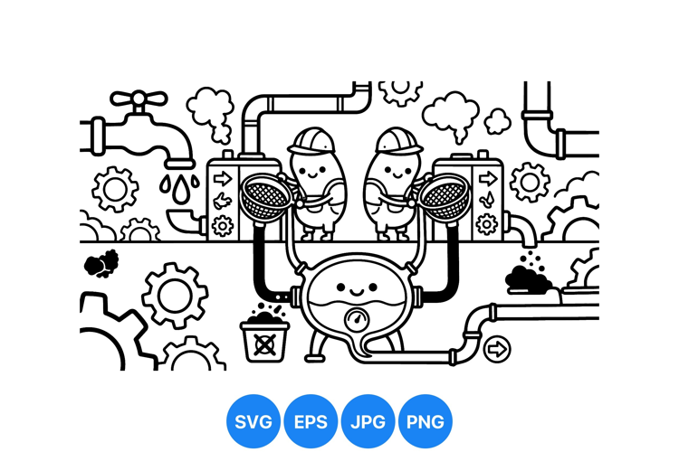 A playful cartoon scene shows two factory worker characters holding sieves inspecting pipes surrounded by gears, steam, and industrial equipment in a whimsical black and white design.