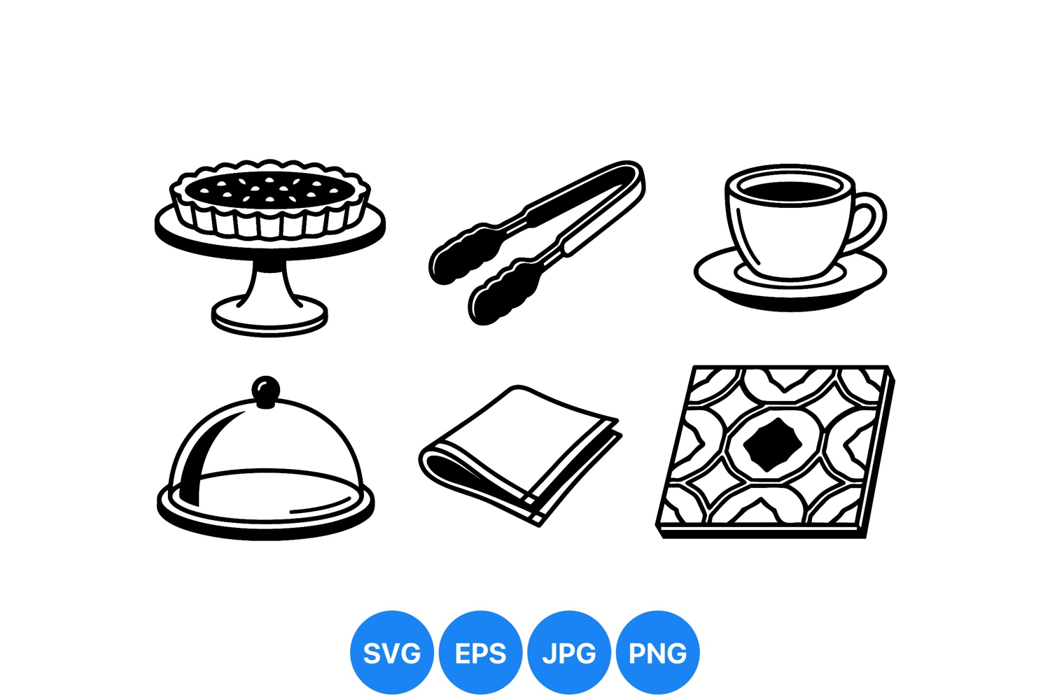 Monochrome vector icons include pie plate with dessert tongs coffee cup on saucer cloche napkin folded and patterned tile showing kitchen and dining elements in simple flat style