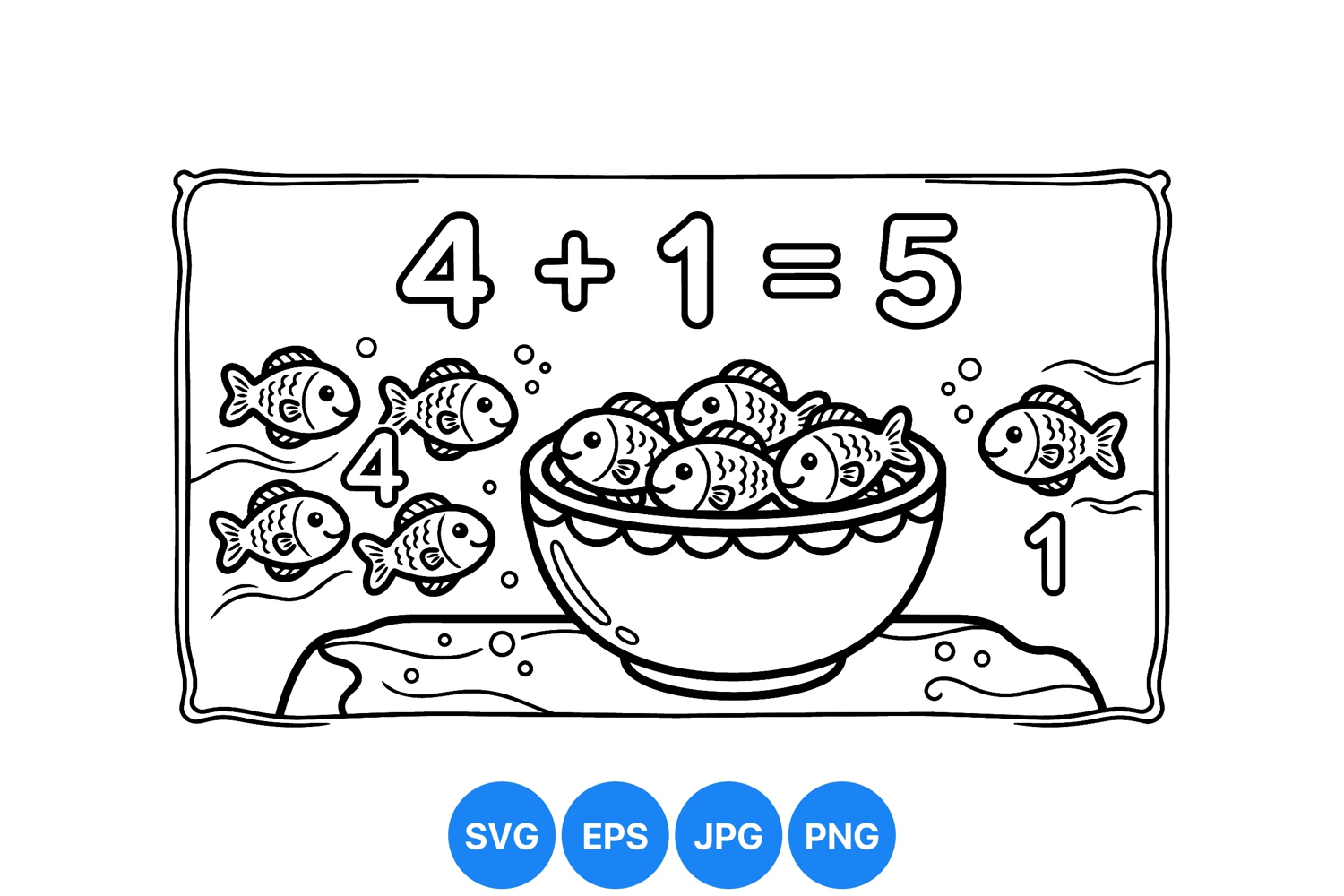 A monochrome vector illustration showing four fish swimming plus one fish swimming near a bowl filled with five fish highlighting basic addition for kids and early math skills