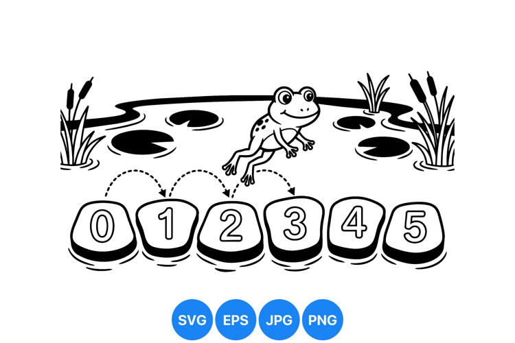 A cute cartoon frog jumps playfully across lily pads numbered zero through five in a pond scene with cattails and water plants in black and white style cheerful mood