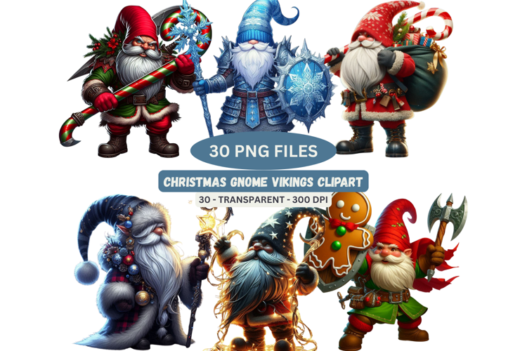 Each gnome is designed full-body with Christmas outfits, Viking helmets, candy cane weapons, ornaments, snowy shields, and holiday props. Great for planners, stickers, sublimation, mugs, shirts, invitations, and more!
