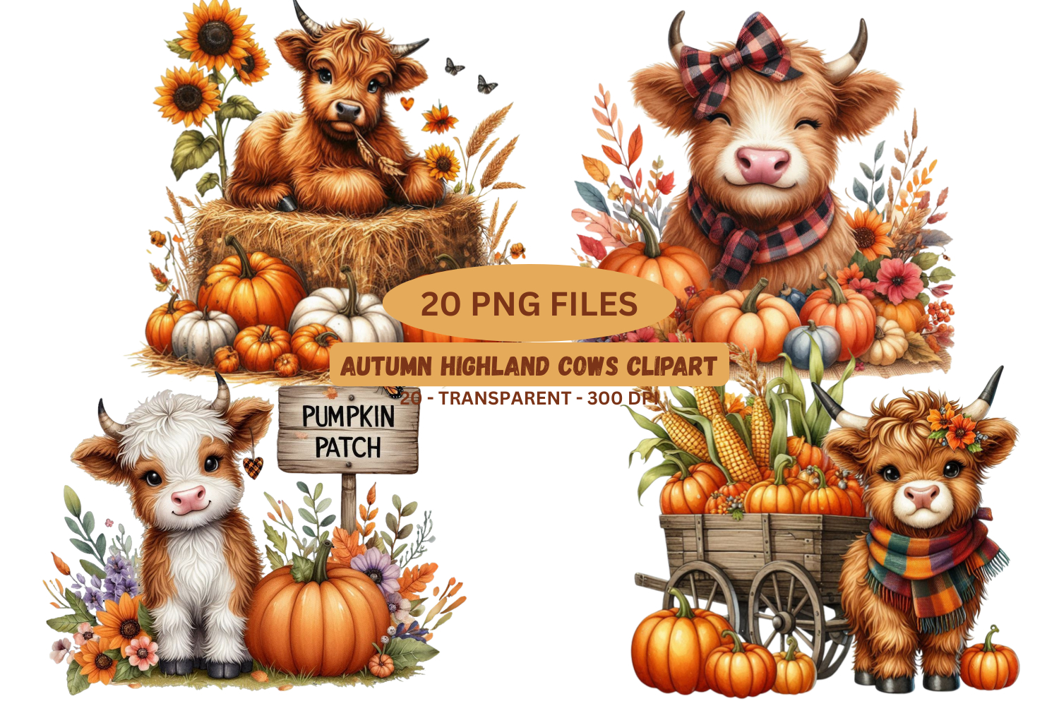 Adorable 20 Autumn Highland Cow PNG Bundle featuring fluffy baby cows in cozy farmhouse fall style. Each cow is dressed for autumn — with plaid scarves, pumpkins, sunflowers, fall leaves, acorns, lattes, and harvest baskets. Perfect for sublimation on shirts, mugs, tote bags, farmhouse signs, stickers, invitations, and Thanksgiving décor.