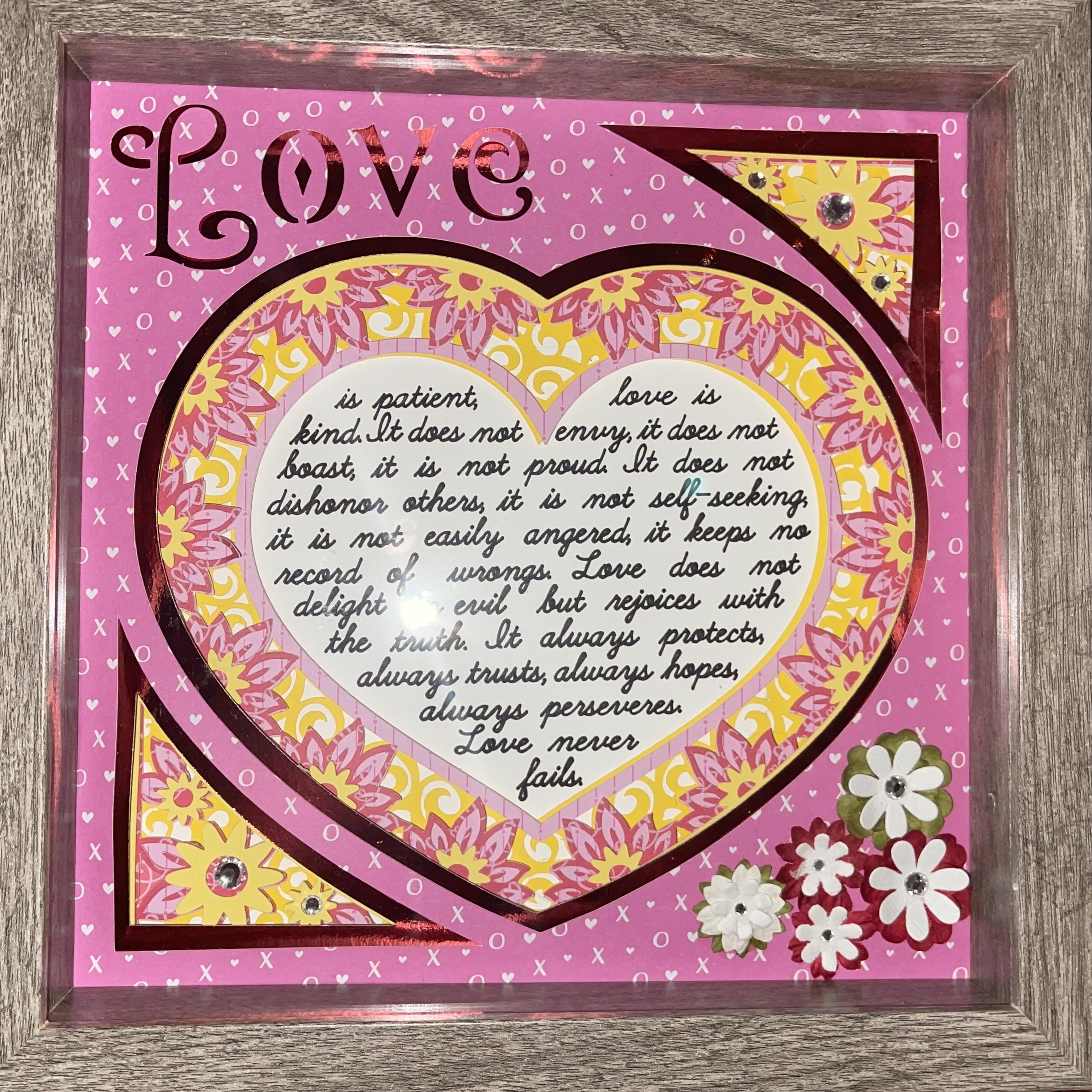 This 3D LOVE IS PATIENT SVG is a multi media design. You will use cardstock to cut the 7 layers and then your pen or foil quill to write the scripture, 1 Corinthians 4-8, with your Cricut or Silhouette. This will make a great valentines gift or give it to a loved one any time to let them know how much you care