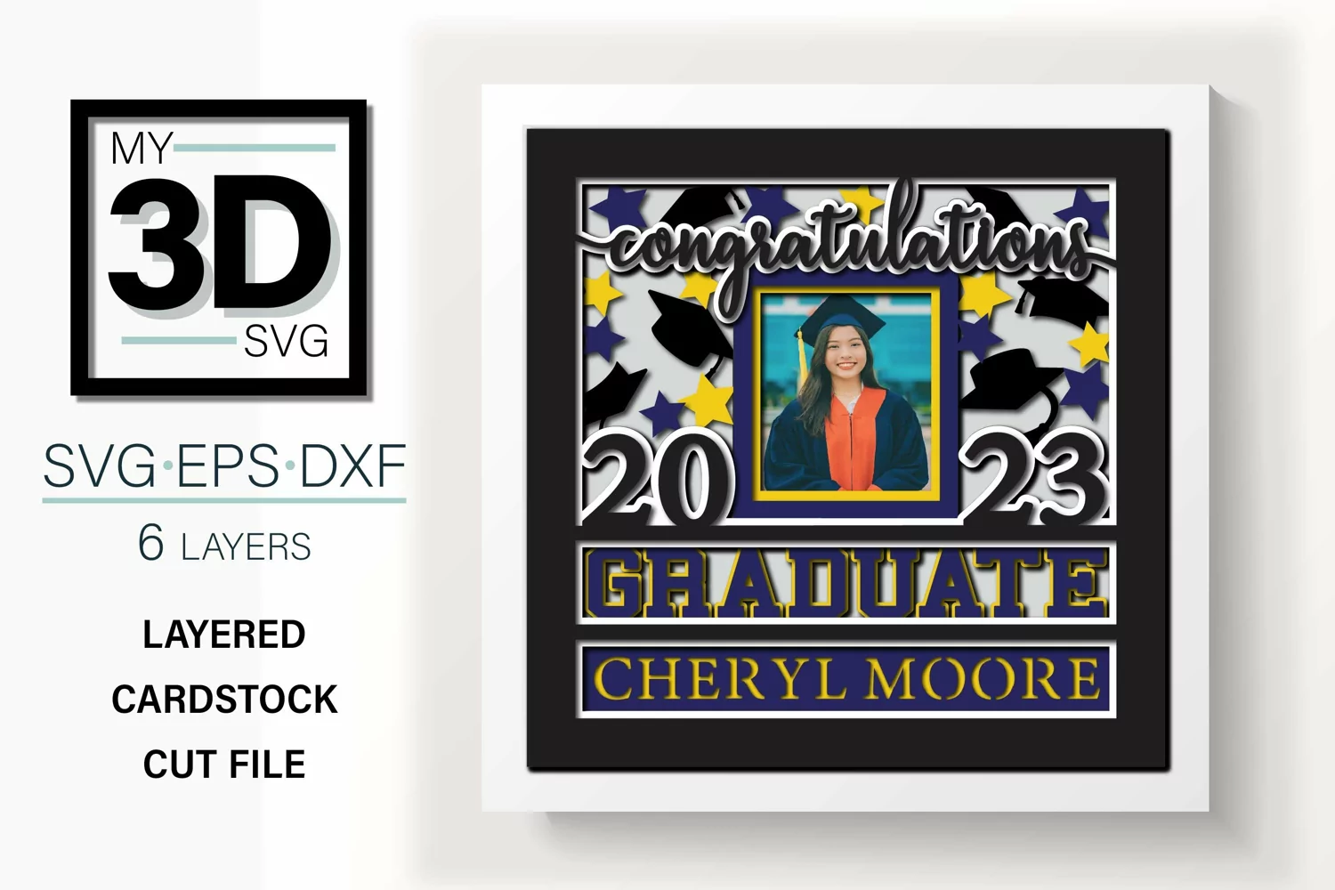 This 3D Customizable Graduation SVG is able to be personalized with the graduate's name and school colors. There is even a spot to add a picture of the graduate. Files included for the years 2020, 2021, 2022, or 2023. This project is 6 layers and includes stencil style letters so that you can easily add the graduate's name to the design.