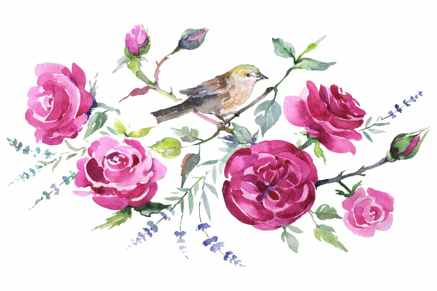 Bouquet with roses and a bird Watercolor png clipart of 1 files. Ideal material for DIY, wedding invitations, greeting cards, quotes, blogs, posters and more.