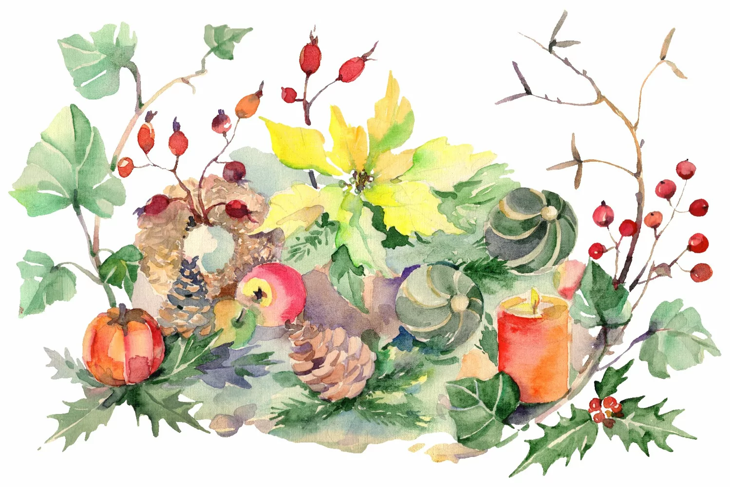 Christmas bouquet snowstorm Watercolor png clipart of 1 files. Ideal material for DIY, wedding invitations, greeting cards, quotes, blogs, posters and more.