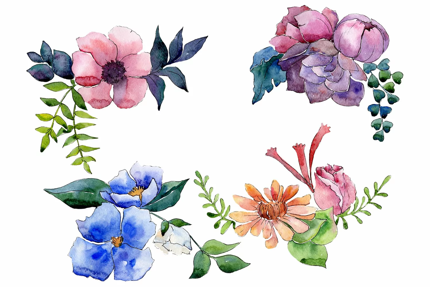 Flower Symphony watercolor png clipart of 4 files. Ideal material for DIY, wedding invitations, greeting cards, quotes, blogs, posters and more.