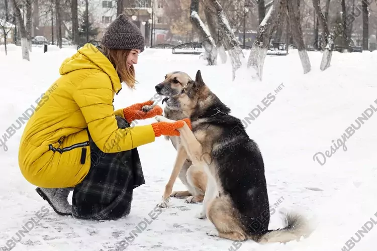 Young woman with her two dogs in a snowy winter park. Dogs give paws to the owner.