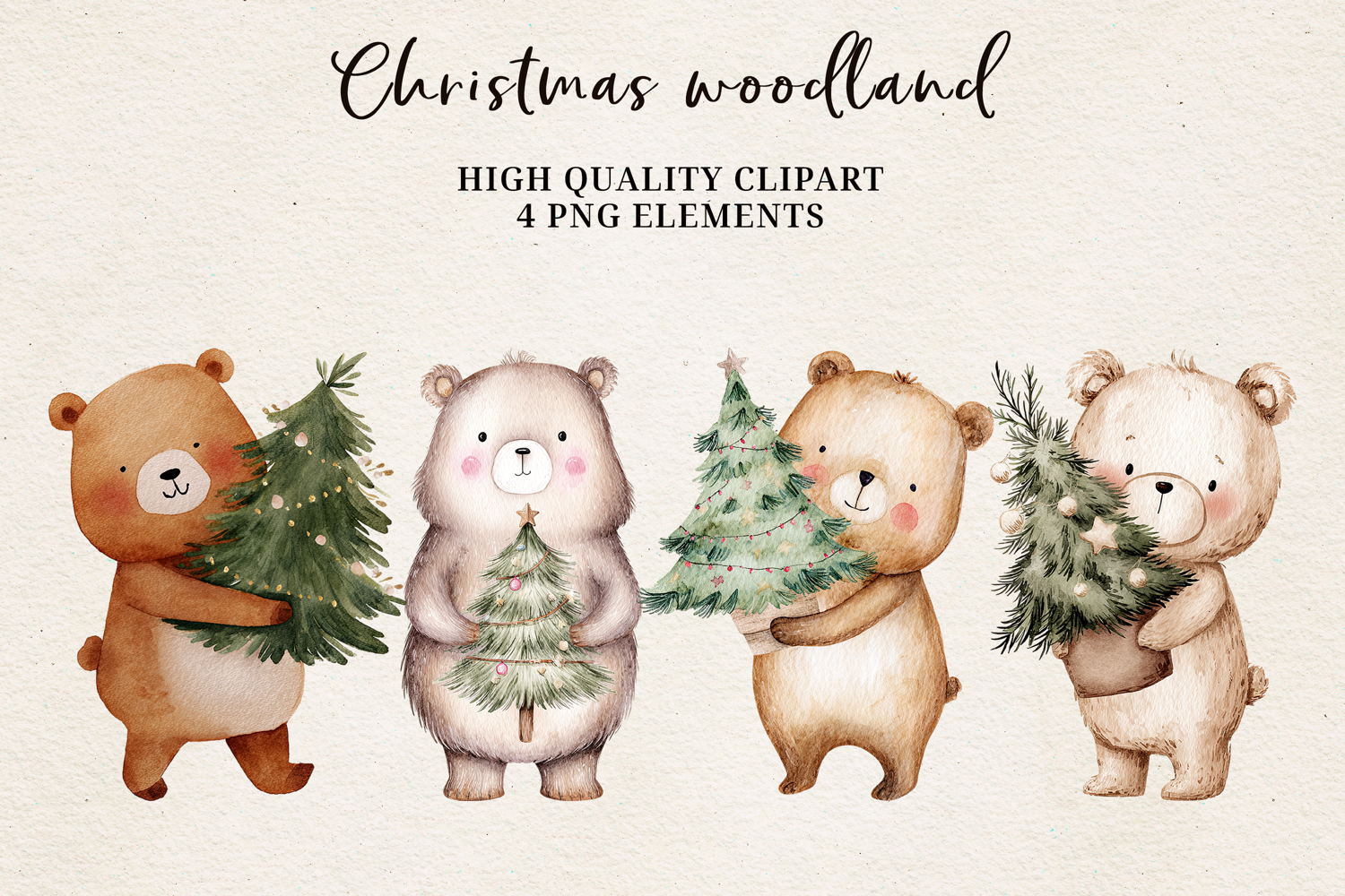 Bring festive woodland charm to your holiday projects with this adorable Christmas Woodland Bear Clipart set! This collection includes 4 high-quality watercolor PNG elements, each featuring a cute bear holding a decorated Christmas tree. Soft textures, warm winter tones, and a hand-painted storybook feel make these woodland characters perfect for cozy seasonal designs.