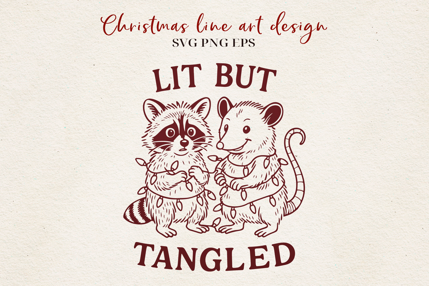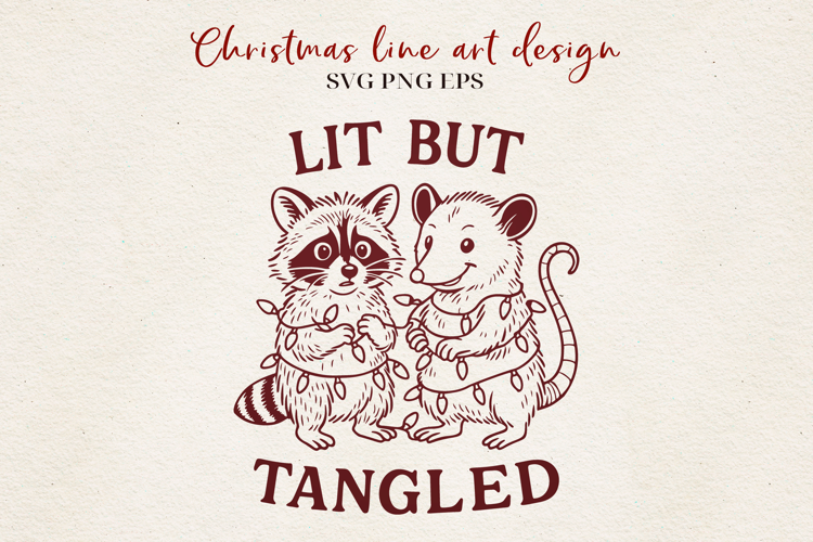 Lit But Tangled SVG | Funny Christmas Raccoon & Possum Line Art | Holiday Lights SVG PNG EPS