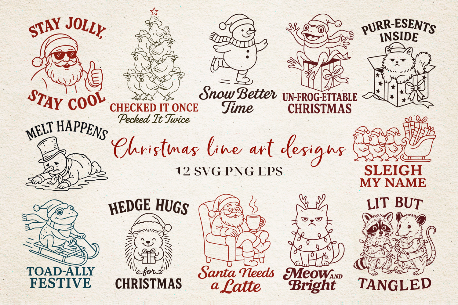 Christmas Line Art Bundle SVG | Holiday Animal Puns | 12 Christmas Designs SVG PNG EPS