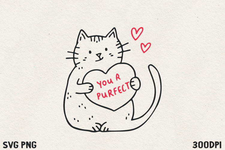This adorable illustration features a cute cat holding a big heart with the phrase “You are purrfect”, creating a sweet and playful Valentine design.