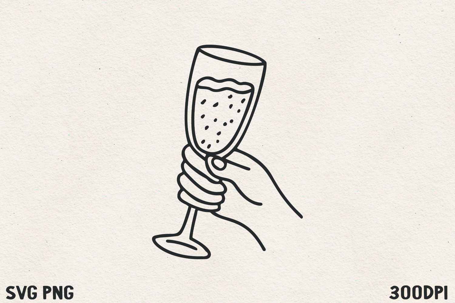 This elegant line art illustration shows a hand holding a champagne glass, capturing the mood of celebration, love, and special moments.