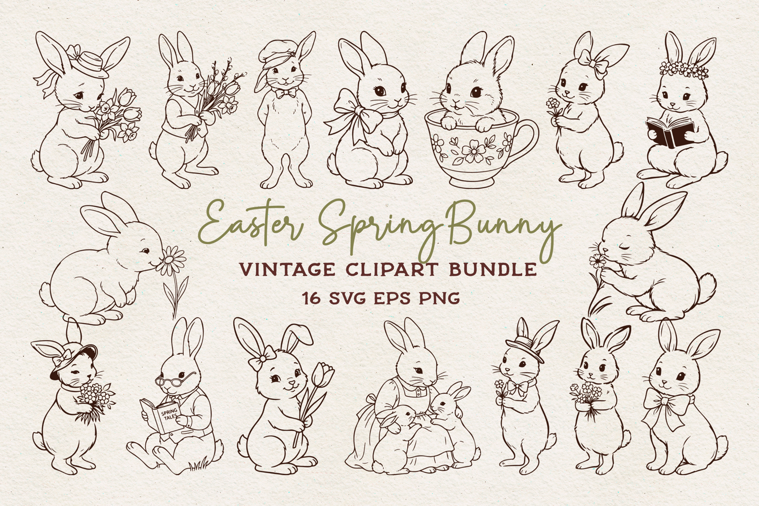 Easter Bunny Bundle – 16 Cute Spring Rabbits | Vintage Bunny Line Art SVG PNG EPS
